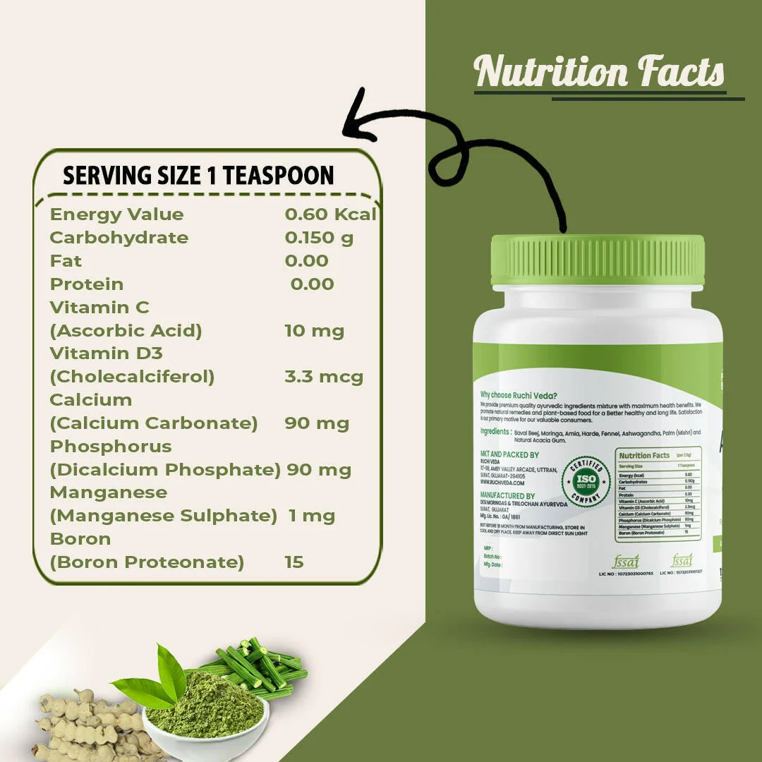 Baval Beej, Moringa, Amla, Harde, Fennel, Ashwagandha, Natural Acacia Gum, Palm (Mishri)