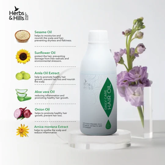 •  Sesame Oil: It helps to moisturize and nourish the scalp and hair, preventing dryness and flakiness