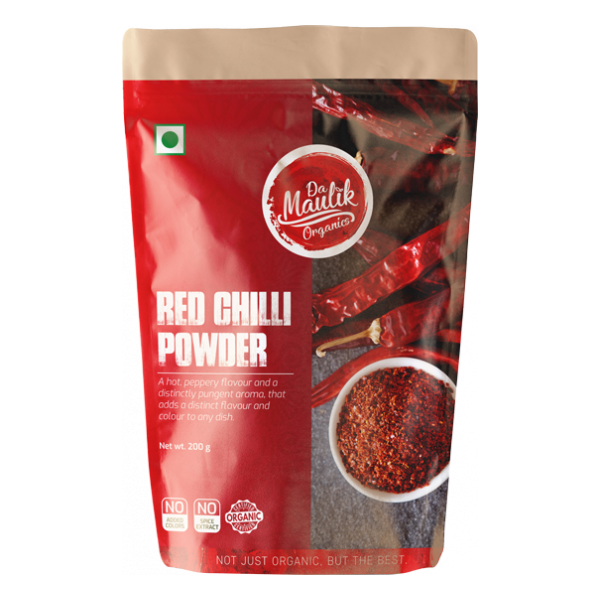 Red chilli powder is commonly used in Indian cuisine to give a wonderful spicy touch to the food. DaMaulik Organics red chilli powder is pure, unadulterated processed from organic whole red chilli. The stem and seeds are removed from the red chilli and then ground to keep the aroma and the taste intact while imparting your curries with the right amount of pungency. Before packing it is cooled and checked for quality to ensure its purity.