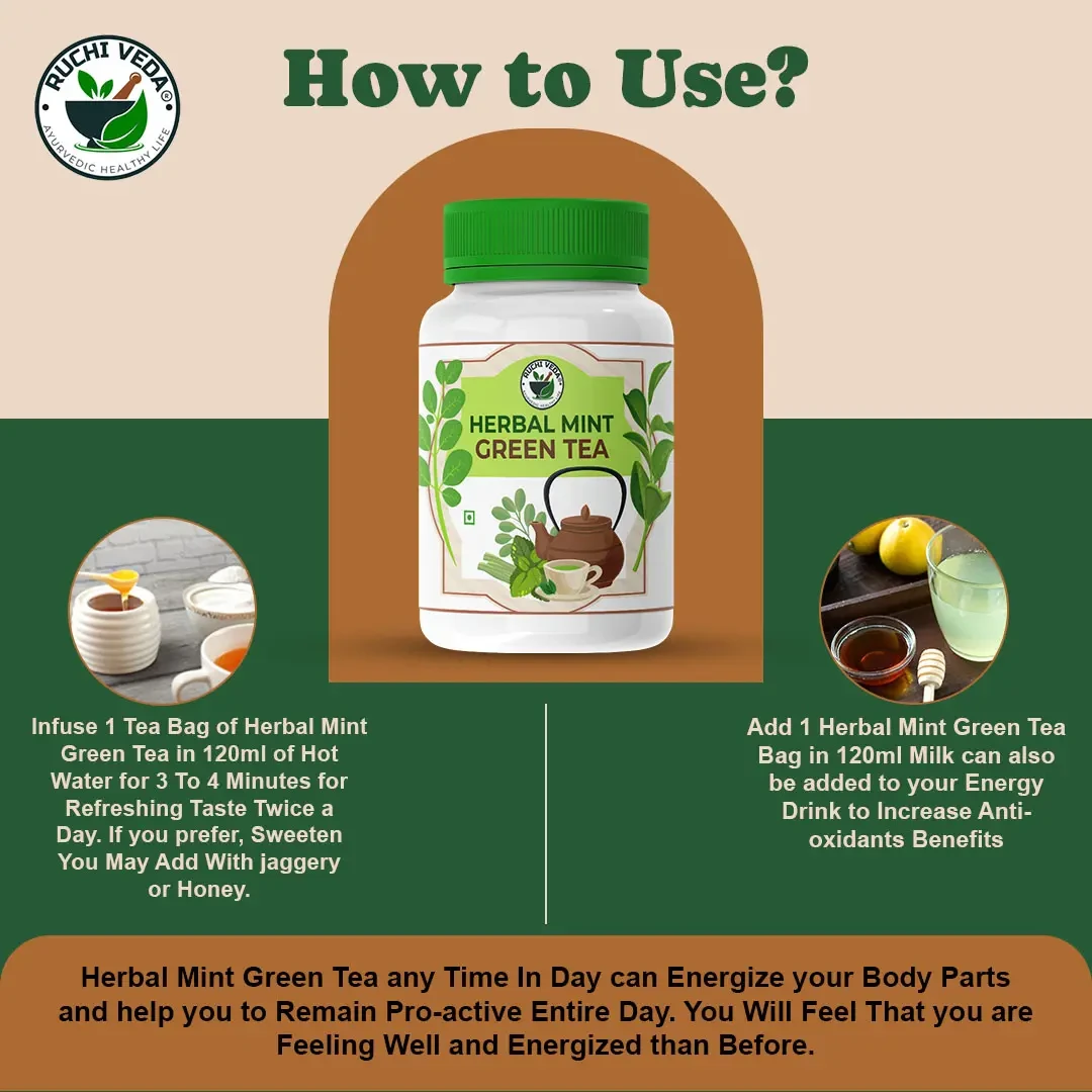 Infuse 1 tea bag of herbal mint green tea in 120ml of hot water for 3 to 4 minutes for a refreshing taste twice a day. Sweeten it with jaggery or honey if desired.