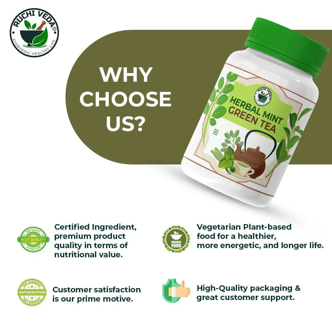 Embrace wellness with our invigorating "Herbal Mint Green Tea," carefully crafted to revitalize your senses and nourish your body. Unlock the countless green tea benefits, including aiding weight loss and promoting overall health. As one of the best green tea brands, we offer premium quality at an affordable green tea price. Delight in our herbal blend and explore new green tea recipes while experiencing the satisfaction of choosing Ruchi Veda for your well-being journey!