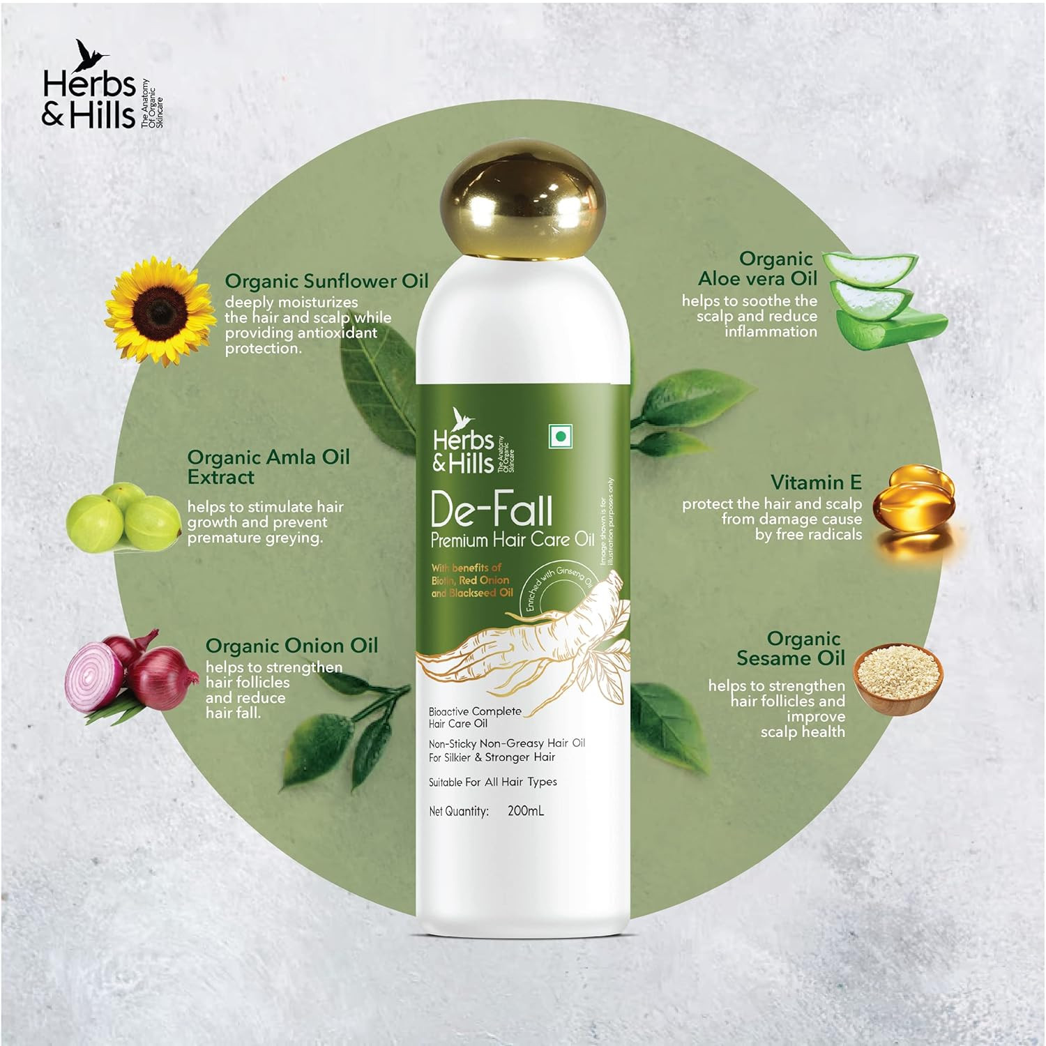 Herbs & Hills De Fall Premium Hair Care Oil - 200ml with Benfits of Biolin, Red Onion and Blackeseed Oil, For All Hair Types, Helps to Promote Hair Growth, Strength & Shine, Improves Scalp Health