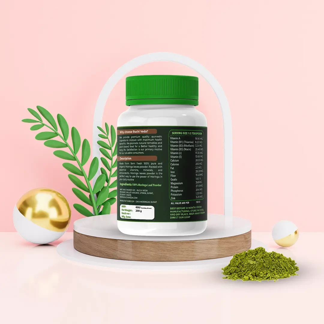 Dive into the goodness of nature with our premium "Moringa Leaf Powder." Packed with potent Moringa benefits, this powder is your gateway to enhanced well-being. Whether you prefer Moringa powder, leaves, or capsules, we've got you covered with top-notch quality and customer satisfaction guaranteed. Experience the nourishing power of Moringa with Ruchi Veda and embark on your journey to a healthier, happier you!