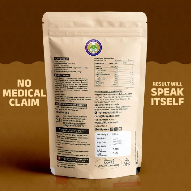 - Dosage: Every night before going to sleep, drink one spoon (5 grams) of Bilipatra Nirant Churn with water.