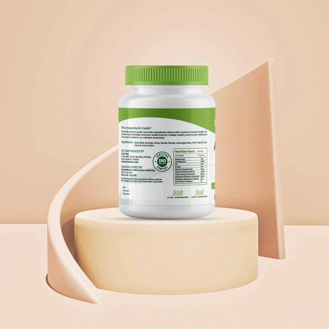 Baval Beej, Moringa, Amla, Harde, Fennel, Ashwagandha, Natural Acacia Gum, Palm (Mishri)