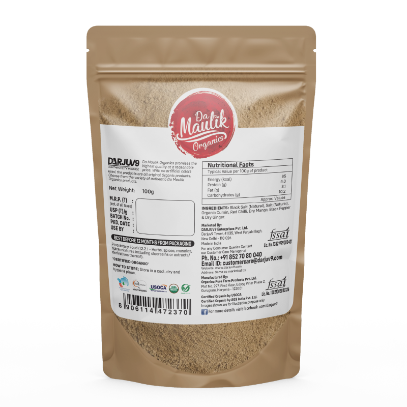 INGREDIENTS: Black Salt (Natural), Salt (Natural), Organic Cumin, Red Chilli, Dry Mango, Black Pepper & Dry Ginger.