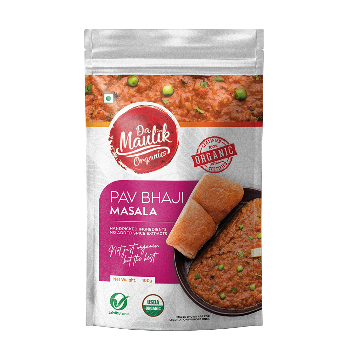 Pav Bhaji is an essential part of Indian cuisine, Pav-bhaji is incomplete without its distinct spices, flavours and aroma. DaMaulik Organics Pav bhaji masala offers all the colour, flavour and aromatic essence needed for a delicious plate of Pav bhaji because of the organic whole spices used in making it.