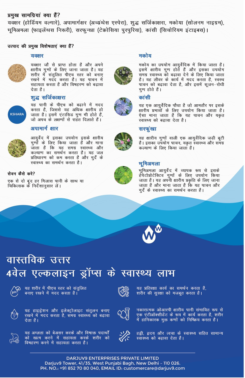 Yavakshar (Hordeum vulgare), Apamargkshar (Achyranthes aspera), Purified Sarjikakshara, Makoya (Solanum nigrum) distillate of whole plant, Bhumilamla (Phyllanthus niruri) distillate of whole plant, Sarphunkha (Tephrosia purpurea) distillate of root, Kansi Aq. (Cichorium intybus) distillate of whole plant. Dosage Take 1-2 drops with every glass of water or as directed by the physician. Health Benefits It helps to maintain a balanced pH level in the body. It supports hydration and helps maintain electrolyte balance. It assists in detoxifying the body by neutralizing acidity and aiding in eliminating toxins. It helps to improve immunity. It helps maintain a healthy digestive system and supports optimal digestion. Promotes general well-being, including bone health, heart health, and skin health. It helps to neutralize harmful free radicals in the body